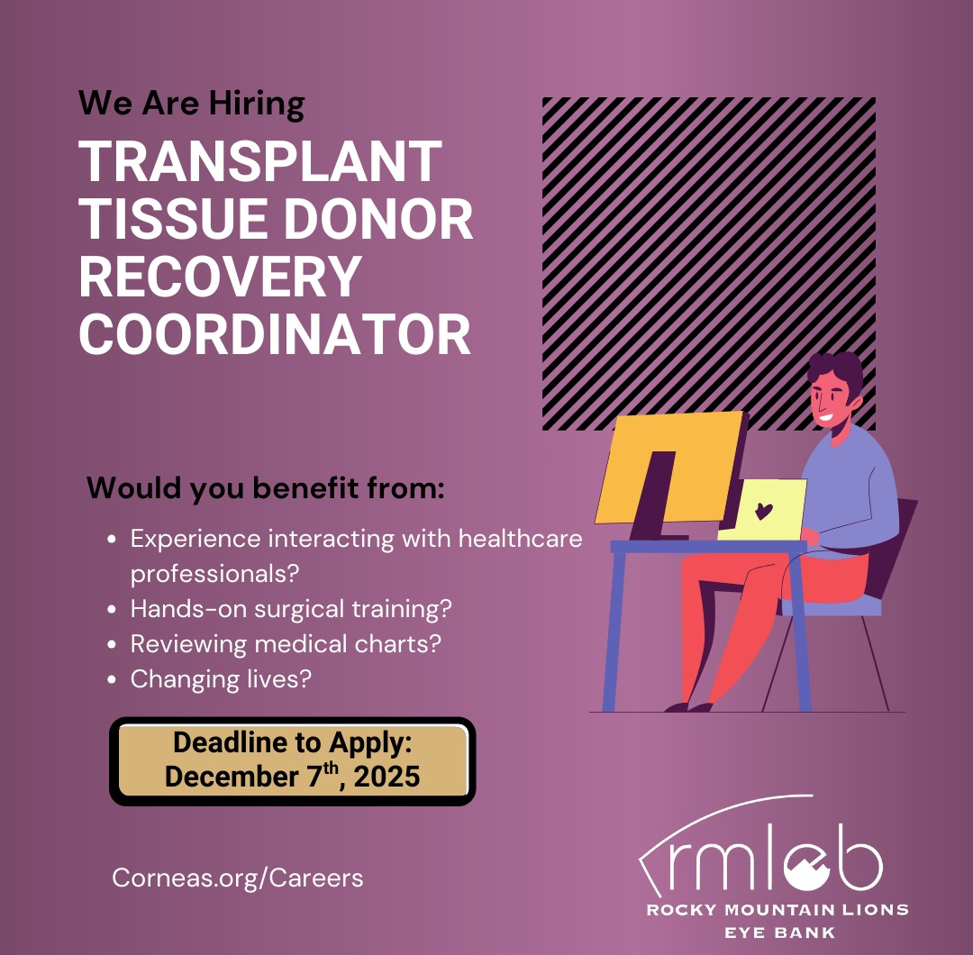 We welcomed friends and made new ones at the recent Denver Broncos versus KC Chiefs game at Empower Field at Mile High. All enjoyed learning more about restoring hope and sight through eye donation and transplantation. We can't wait to see more donor families, cornea transplant recipients and new friends at our next event in #BroncosCountry! The Circle of Light Photo Project presented by Rocky Mountain Lions Eye Bank is now on display through Dec. 15 at Intermountain Health Good Samaritan Hospital in Lafayette, Colo. The exhibit features photos taken by people who had been blind and had their sight restored through cornea transplants. We are hiring! Become part of a mission that transforms eye donor gifts into hope.