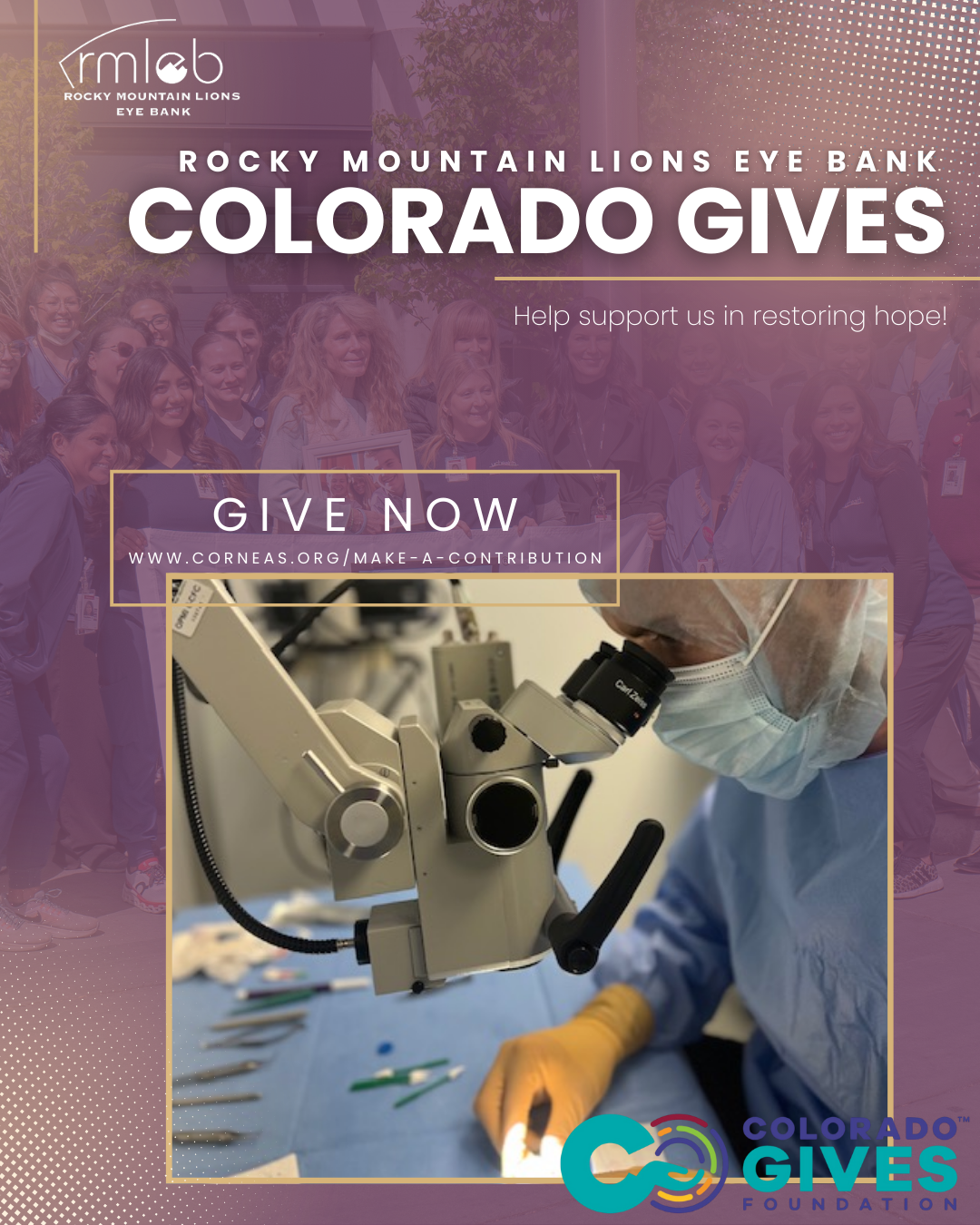 Today is Colorado Gives Day, so consider giving to help us continue to restore hope. With your contribution, RMLEB can continue to fulfill the wishes of donors and their families to help another overcome blindness through transplantation and research. Through the lens of restored vision, those touched by eye donation gain a clearer view of the world—a world where the gift of sight becomes a shared experience, enriching lives and fostering hope.